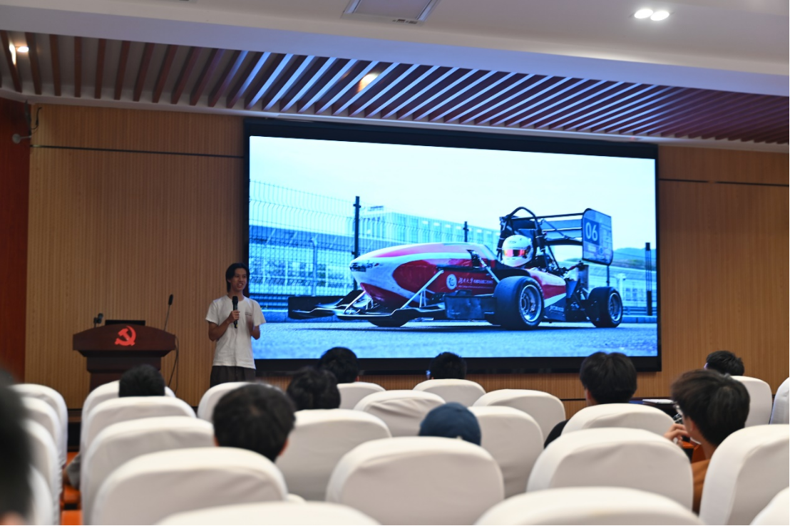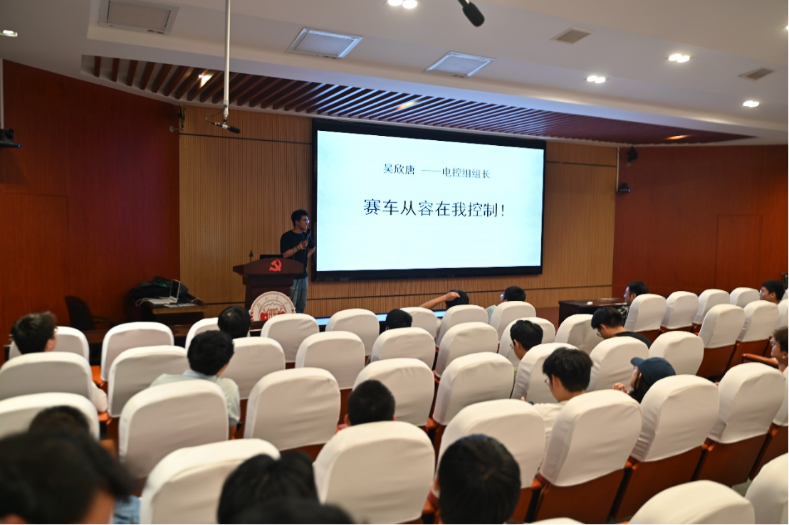 接下来,车队各部门负责人依次上台,详细介绍了各自团队的工作内容与日常趣事。从负责车辆设计与制造的技术部,到保障车队运营的商业组,再到记录车队点滴的宣传组,负责人与新生们分享了各自团队在研发、训练、参赛中的故事。大家在分享中不仅讲述了车队如何克服技术难题,完成赛车设计与制造,还通过幽默风趣的语言,将暑期培训、参赛的点滴趣事娓娓道来,现场气氛轻松愉快。新生们被每一位车队成员的专业与热情深深感染,现场不时爆发出热烈的掌声与笑声。