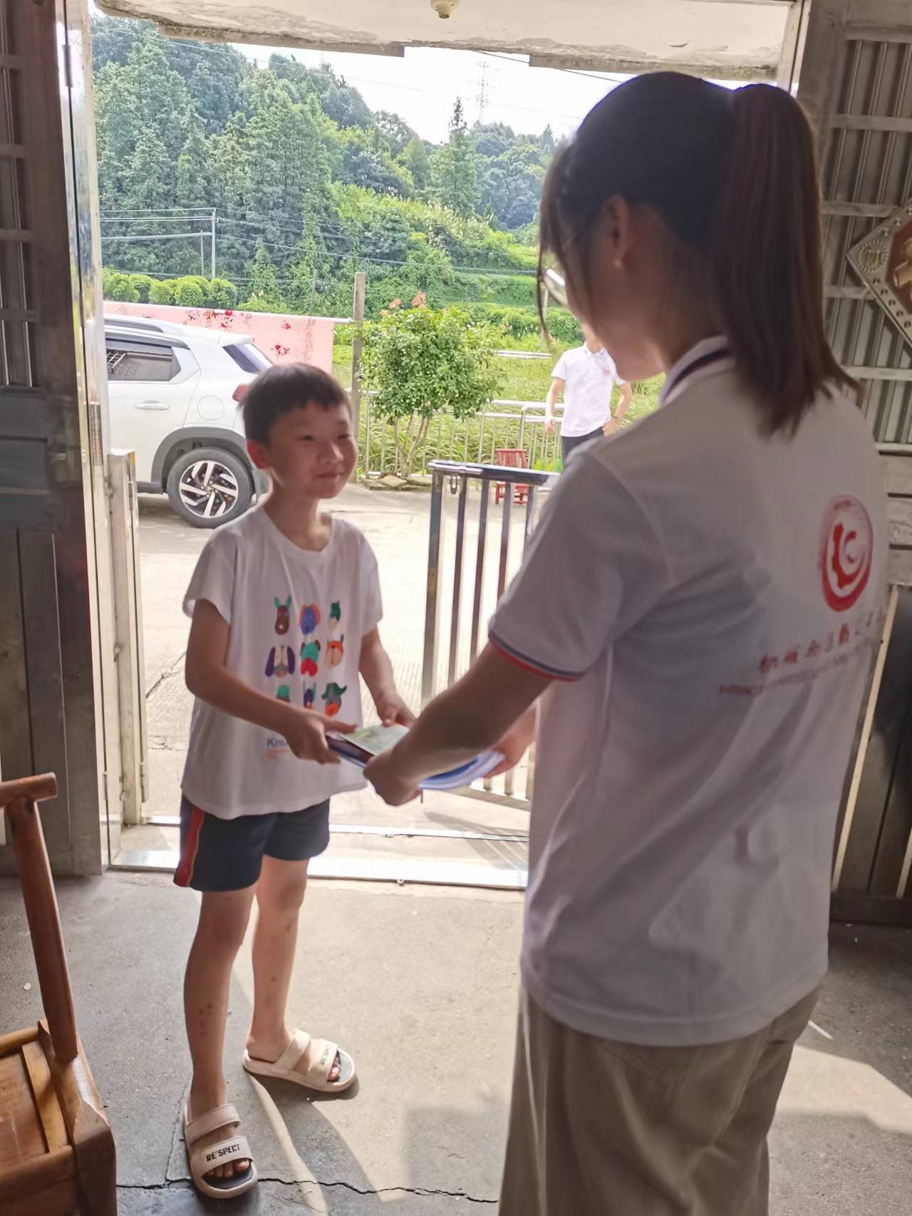 见到家里来人,老人的孙女也探出头来观望,我们就顺势叫她一起来聊天,再询问了学习有关的内容后,队员给小朋友送上了先前筹备的哔咔漫画