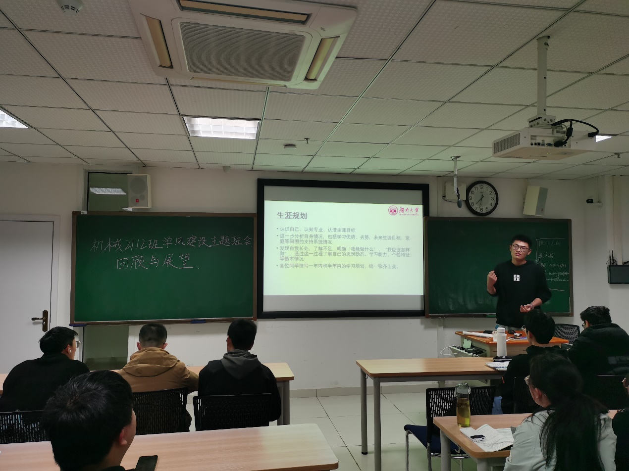 新学期,新开始。为回顾并总结上半学期的学习成果,更为了及时查缺补漏、进行下一学期的学习,机械2112班班长王新宇于周三晚在研A401召开了“回顾与展望”主题班会。