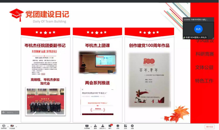 受新冠疫情影响,本次大会采用腾讯会议线上会议的方式进行。线上会议与线下会议相比更简洁环保,也更即时高效。会议在杜佳俊同学的主持下准时开始,简单介绍完会议要求后,各班答辩发言人开始以PPT的形式为我们展示各班级优班建设的过程和已经取得的成果。