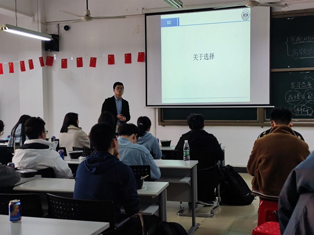 祝晓龙学长引用最近两会中习近平总书记的话,从宏观的角度告诉我们要在本科阶段打好基础、打牢基础。思维层次不能只限于目前课程学习上,而是要将视野放长远,面向国家、社会的重大需求。同时,他通过自己本科时的例子跟我们说明了做好计划的重要性,要把每一件事都做深做透,切忌广而不精,泛而不深。最后,他送给我们一句祝愿:“脚踏实地,仰望星空。”