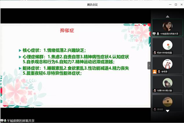 接下来,闫智琪老师向大家介绍了心理不健康的两种类型,心理问题和精神障碍,并通过案例讲述了精神障碍的标准和可能出现的症状。她特别强调要注意区别抑郁情绪和抑郁症之间的区别。抑郁情绪是每一个正常人都会出现的情绪,是一种正常的心理情绪波动,一般持续时间不超过两周,主要表现为情绪低落;而抑郁症是一种心理健康疾病,它会导致人体生理上的不舒服,包括食欲不振,精神萎靡等,一般晨重昼轻,严重会伴有自杀倾向。闫老师指出,在新生助理工作期间,要关注新生情绪,一旦出现有计划或想要自杀的同学,一定要及时沟通开导,同时要注意方式方法,避免刺激到情绪波动较大的同学。
