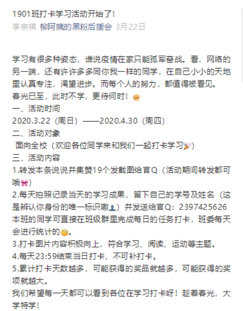 活动开始前,班委通过班级微信公众号和官方QQ号动员全班同学,对本次活动进行了大力宣传,获得很大反响,有许多外班同学通过各种渠道了解并参与到学习打卡活动中。