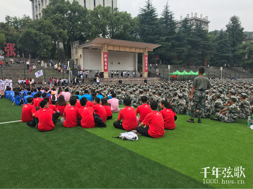 下午大家在训练场集合后,由教官带队到指定位置,全操场集合在主席台前,新生班助集合在队伍左侧,整齐列队看演出。主席台上准备好了话筒音响麦克风,社团表演人员也在主席台前的一侧就位完毕,看台上也有很多观众准备就绪,大家都十分的期待。