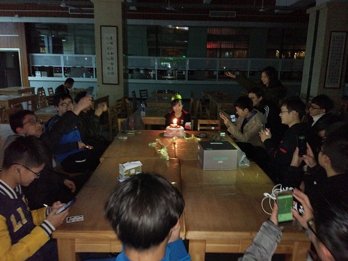 11月18日晚上九点,我院1712班的同学们相约一堂,在一食堂里积极准备,为班上的女同学庆祝生日,同时,也是一场班级成员间增进感情的聚会。
