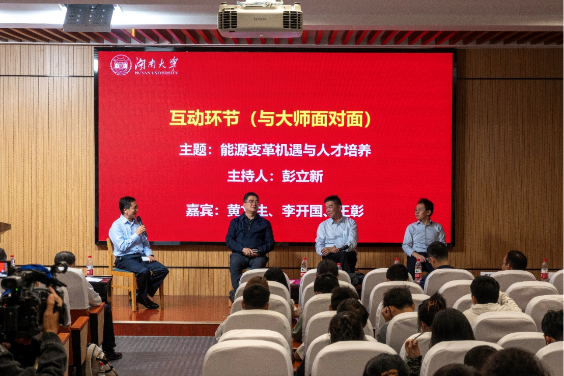 彭立新主持了“与大师面对面”互动环节,黄文生、李开国、王彰参与对话。嘉宾围绕“能源变革机遇与人才培养”进行了精彩的互动,并回答了同学们提出的相关问题,同学们表示深受启发。
