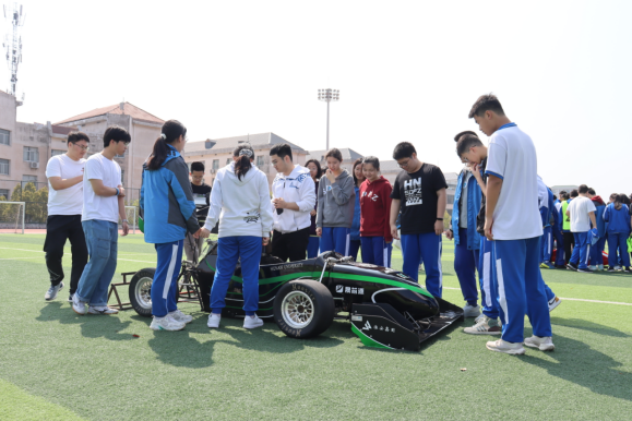赛车队的精彩演示。在车手的驾驶下,方程式赛车如离弦之箭在跑道上飞驰,发动机的轰鸣响彻云霄,现场观众纷纷为之震撼并用手机记录下这激动人心的时刻。随后,赛车队成员们与高中学生们进行了深入的互动交流,分享赛车技术的奥秘和科技创新的乐趣。