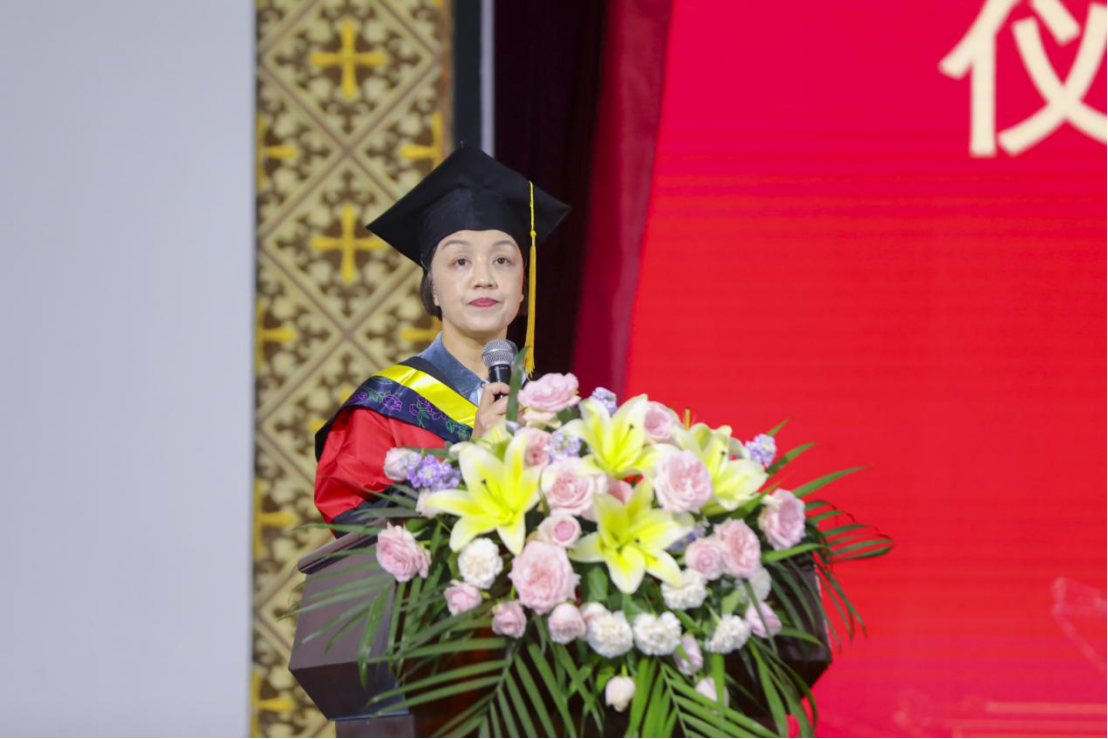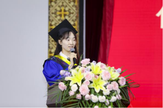 研究生代表卓凤玲表示这一路紧凑的生活方式与科研节奏让自己收获了累累硕果,引用习总书记语录:“希望广大科学家和科技工作者肩负起历史责任,面向世界科技前沿、面向经济主战场、面向国家重大需求、面向人民生命健康,不断向科学技术广度和深度进军。”愿与各位毕业生共勉,在未来的道路上始终保持“乘风破浪”的姿态。