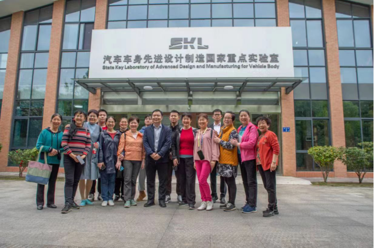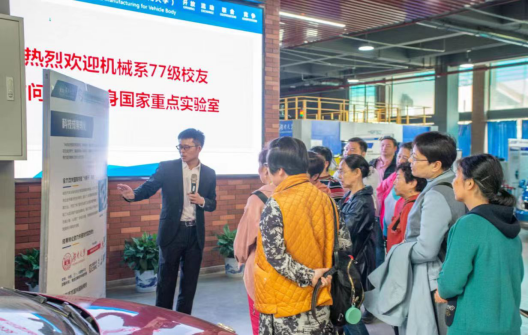 校碑下集体合影并按照当年班级分开合影,回忆当年学生时代生活。拍照完,大家来到国家重点车身重点实验室,由贺书记和李彬学长讲解,在讲解过程中师姐对于一些车身制造提出了一些关于自己的见解,师姐们对探月车样车产生了浓厚的兴趣,在增材减材方面师姐发出感叹与她们那时的技术有了极大的提升,最后师姐们在车身实验室门口合照,并对如今国家重点车身制造实验室取得的成果感到高兴。