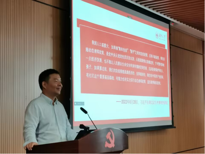 紧接着,贺书记开始题为《高校统筹疫情防控和经济社会发展》的党课,党课中贺书记带着大家回顾疫情爆发以来的各种事件,为大家介绍了我国疫情防控的基本政策以及我国疫情防控情况,通过国内国外的对比让大家再次深刻的认识到疫情防控措施的重要性。随后,贺书记带着大家分析了我国GDP、粮食产量、工业规模、社会零售额、全国固定资产投资、进出口总额等数据,让大家直观的看到我国经济的迅速发展。