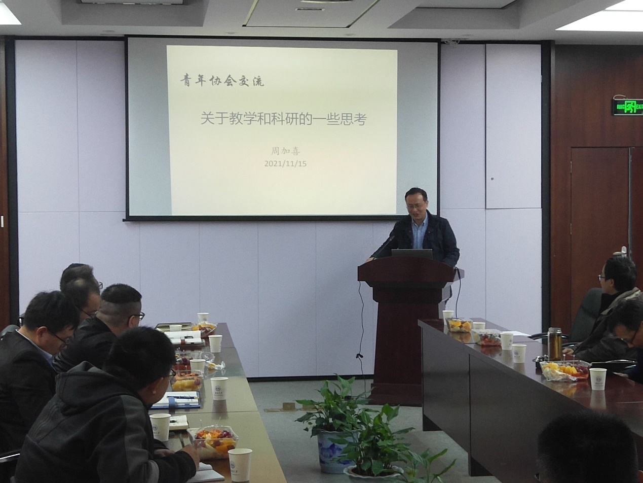 周加喜在会上作“关于教学和科研的一些思考”主题报告,从“特色研究,学术标签”、“自力更生,丰衣足食”、“勤于总结,注重宣传”等几个方面进行经验交流。他表示,青年教师一定要坚持特色研究,以此形成自己的学术标签,在此基础上,应认真积极申请科研项目,努力争取外部资源,同时,青年教师要格外注意横向课题勿多勿杂,聚焦于自身研究方向,多和同行专家交流汇报。