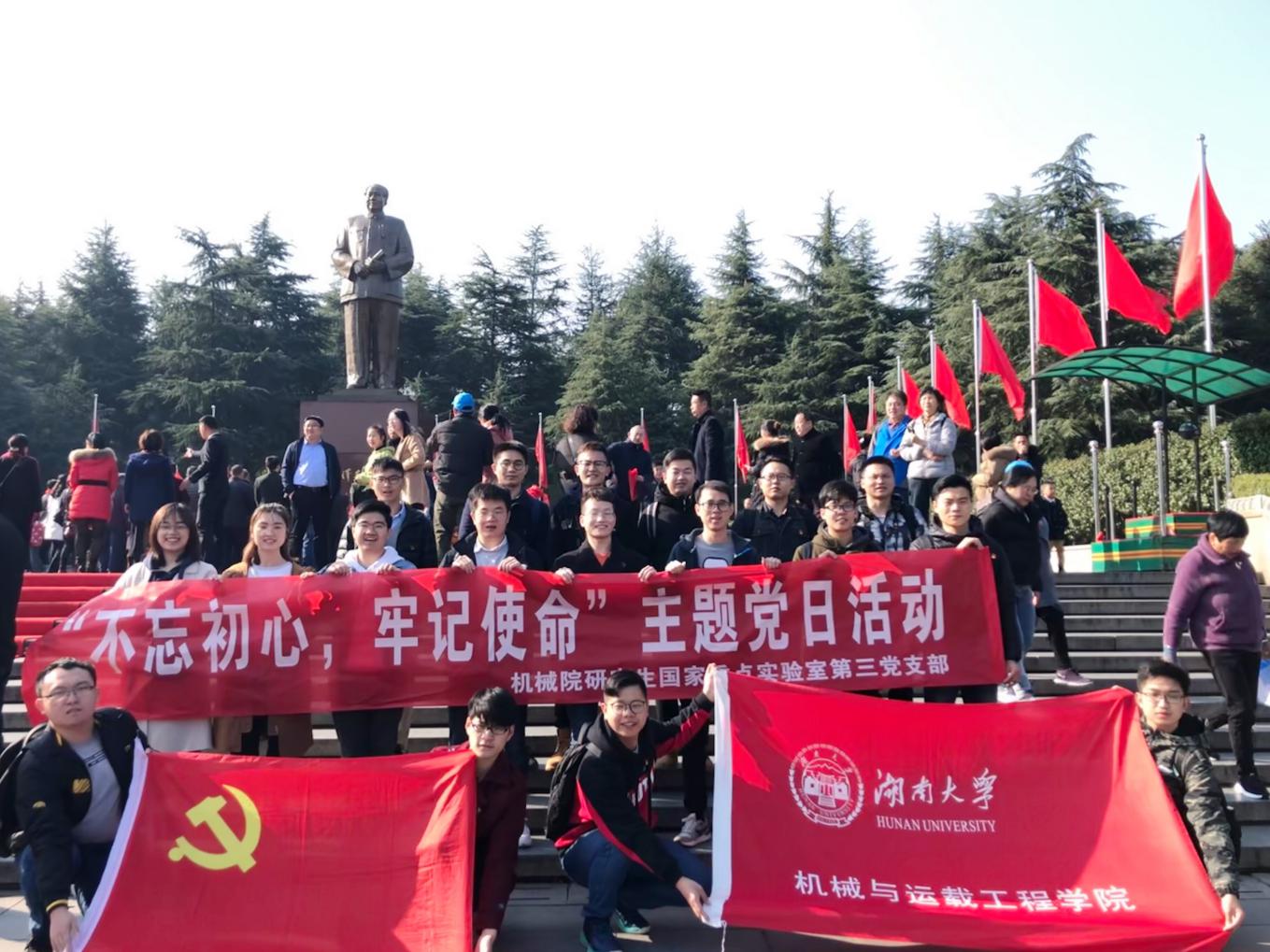 国家重点实验室第三党支部开展“不忘初心,牢记使命”主题党日活动,支部党员、入党积极分子来到韶山毛泽东同志故居,瞻仰伟人足迹,缅怀伟大领袖。上午9点,同志们来到铜像广场,瞻仰主席铜像。铜像广场人山人海,上到胸前挂着军功章的老红军,下到带着红领巾的少先队员,从全国各地慕名而来。导游向同志们介绍,主席铜像是按主席在开国大典上的形象设计的,铜像高6米,象征毛泽东同志为革命牺牲的6位至亲,底座高4.1米,总高10.1米,代表中华人民共和国于1949年10月1日成立。