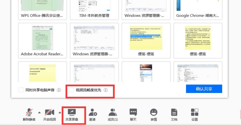 此图标为共享屏幕功能,您可以点击点击此功能键,选择屏幕共享内容,建议选 择视频流畅度优先。