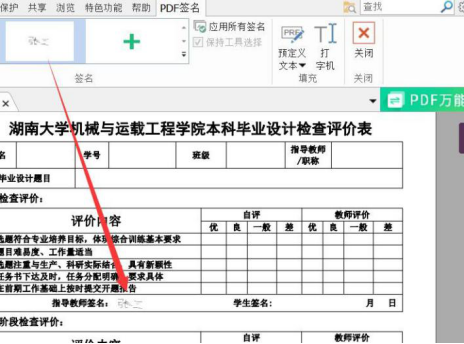 5.在签名栏点击已保存签名并将签名拖至所需位置,保存文件