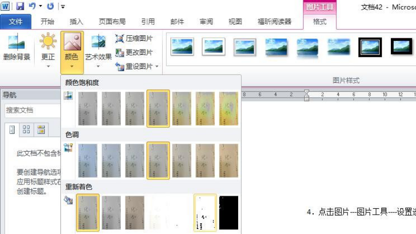 4.点击图片---图片工具----颜色----重新着色,选择“黑白:50%”