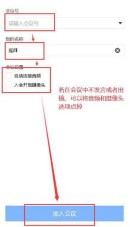 2.3.进入“加入会议”界面,填写会议号与您的姓名,或会议密码,根据您在会议中是 否有发言或者出镜的需要选择音频与摄像头设置,然后点“加入会议”按钮。