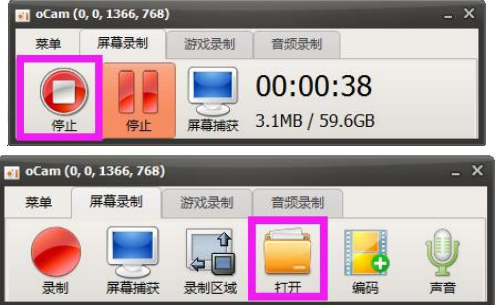 8. 录制完成后,点击“停止”完成视频的录制,点击“打开”按钮打开文件存